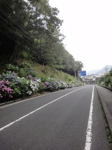 昨日は雨。 あまり雨の降らない梅雨となってますが アジサイはどうだろうか? ササッと用意してスタート。 強い陽射しの中 坂を登ると見えて来ました 道の左右に紫陽花が並びます。 写真撮影されてる方 散歩してる人、ランナーに車の徐行して見物してました…