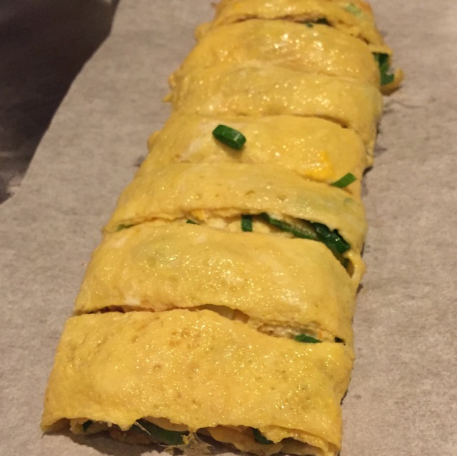 鉄板仕込みの出し巻き卵 鉄板の上で鮮やかに巻かれた卵焼き。